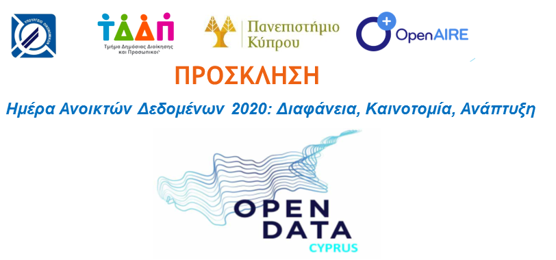 Το Τμήμα Δημόσιας Διοίκησης και Προσωπικού, του Υπουργείου Οικονομικών και το Εθνικό Γραφείο Ανοικτής Πρόσβασης OpenAIRE της Βιβλιοθήκης Πανεπιστήμιου Κύπρου συνδιοργανώνουν ημερίδα με θέμα «Ημέρα Ανοικτών Δεδομένων 2020: Διαφάνεια, Καινοτομία, Ανάπτυξη», με την ευκαιρία της παγκόσμιας Ημέρας Ανοικτών Δεδομένων (Open Data Day 2020), η οποία φέτος είναι η 7η Μαρτίου. Η εκδήλωση θα πραγματοποιηθεί την Πέμπτη, 5 Μαρτίου 2020, από τις 9:00 π.μ. μέχρι τις 13:30 μ.μ., στο Κέντρο Πληροφόρησης – Βιβλιοθήκη «Στέλιος Ιωάννου», Αμφιθέατρο LRC 012, στο Πανεπιστήμιο Κύπρου.