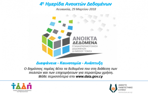 Το Τμήμα Δημόσιας Διοίκησης και Προσωπικού (ΤΔΔΠ), σε συνεργασία με το Ανοικτό Πανεπιστήμιο Κύπρου (ΑΠΚΥ), διοργανώνει την 4η ΗΜΕΡΙΔΑ ΓΙΑ ΤΑ ΑΝΟΙΚΤΑ ΔΕΔΟΜΕΝΑ, στις 29 Μαρτίου 2018, από τις 10:00 π.μ. μέχρι τις 13:30 μ.μ., στην Αίθουσα Πολλαπλών Χρήσεων του Υπουργείου Οικονομικών.Η Ημερίδα απευθύνεται στους δημόσιους λειτουργούς που έχουν οριστεί ως υπεύθυνοι σχετικά με....