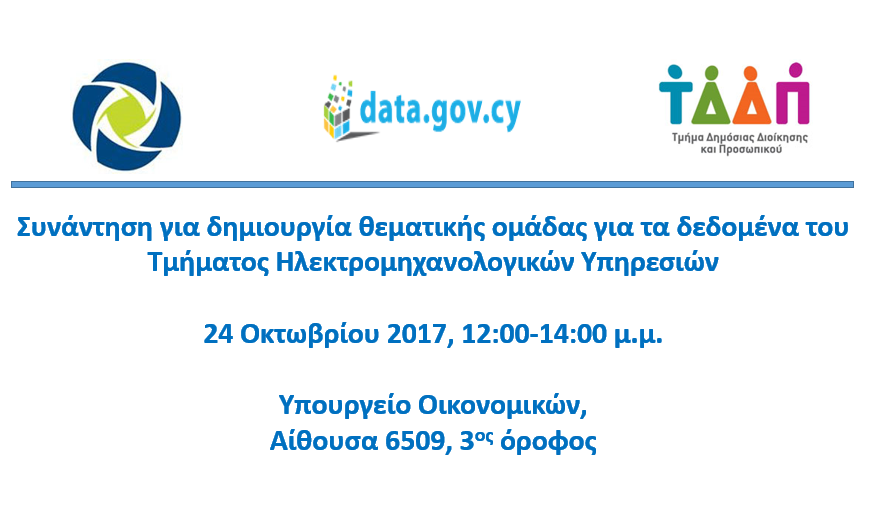 Η Ομάδα Προώθησης της Περαιτέρω Χρήσης των Πληροφοριών του Δημόσιου Τομέα του Τμήματος Δημόσιας Διοίκησης και Προσωπικού (ΤΔΔΠ) και το Τμήμα Ηλεκτρομηχανολογικών Υπηρεσιών (Τ.Η.Μ.Υ) ανακοινώνουν την πραγματοποίηση συνάντησης στις 24 Οκτωβρίου, από τις 12:00 μέχρι τις 14:00, στο Υπουργείο Οικονομικών (Αίθουσα 6509, 3ος όροφος), με στόχο τη διερεύνηση των δυνατοτήτων διάθεσης για περαιτέρω χρήση των δεδομένων που παράγονται από τα συστήματα που διαχειρίζεται το Τ.Η.Μ.Υ.