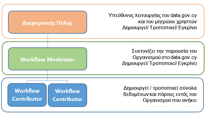 Οι εξουσιοδοτημένοι χρήστες στο επίπεδο «Workflow Contributor», είναι τα κατ’ εξοχήν άτομα τα οποία συντονίζουν, συγκεντρώνουν, «καθαρίζουν» και ετοιμάζουν τα δεδομένα του «Οργανισμού» για δημοσίευση στην Πύλη data.gov.cy. Οι χρήστες αυτοί έχουν τη δικαιοδοσία να δημιουργήσουν σύνολα δεδομένων και να προσθέσουν σε αυτά πόρους, καθώς και να τροποποιήσουν / επικαιροποιήσουν υφιστάμενα δημοσιευμένα σύνολα δεδομένων. Έχουν δηλαδή όλες τις δικαιοδοσίες που έχουν και οι χρήστες στο επίπεδο «Workflow Moderator» πλην αυτή της άμεση δημοσίευσης του συνόλου δεδομένων ή/και του πόρου που δημιούργησαν/ τροποποίησαν. Οι χρήστες του επιπέδου αυτού με τη δημιουργία / τροποποίηση ενός συνόλου δεδομένων μπορούν να το υποβάλουν «για Έγκριση» από τον «Workflow Moderator» του Οργανισμού τους ή από τα μέλη της Ομάδας Διαχείρισης της Πύλης. Οι χρήστες στο επίπεδο «Workflow Contributor» μαζί με αυτούς στο επίπεδο «Workflow Moderator» έχουν την ευθύνη για την έγκαιρη επικαιροποίηση των συνόλων δεδομένων του «Οργανισμού» στον οποίο ανήκουν.